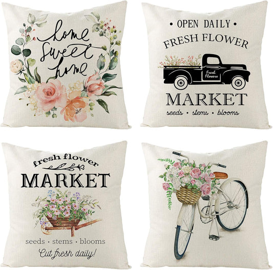 Decorative Spring Floret Throw Pillow Covers – Set of 4, 18” x 18” Linen Cushion Cases